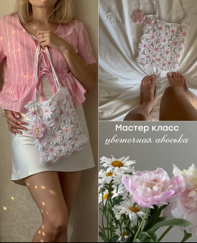 Тёплым летним утром она держала её бережно, словно хрупкий цветок. Авоська, сотканная искусством рук, переливалась нежнейшими оттенками белого и розового, будто солнечный свет касался лепестков пионов. Тонкая пряжа плавно ложилась петлями, создавая кружево изысканной красоты. Каждый стежок был наполнен теплом сердца мастерицы, каждый узелок хранил улыбку воспоминаний.